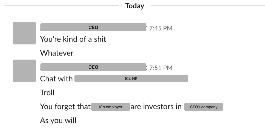 Unfortunately there is some truth in the above in that while it might not represent the truth of the motivations of both sides, it is an accurate depiction of how the way the conflict has been going in that channel makes different people feel. How some companies have been responding has made ICs in the community feel powerless, punched down on, under-valued and disrespected. How some IC members of the community have responded have lead HR folks and founders to feel targeted, yelled at, and like 'the bar' is being set too high. These are uncomfortable truths, and hopefully speaking so plainly about them here does not lead to group inaction; this would be the worst possible outcome.
